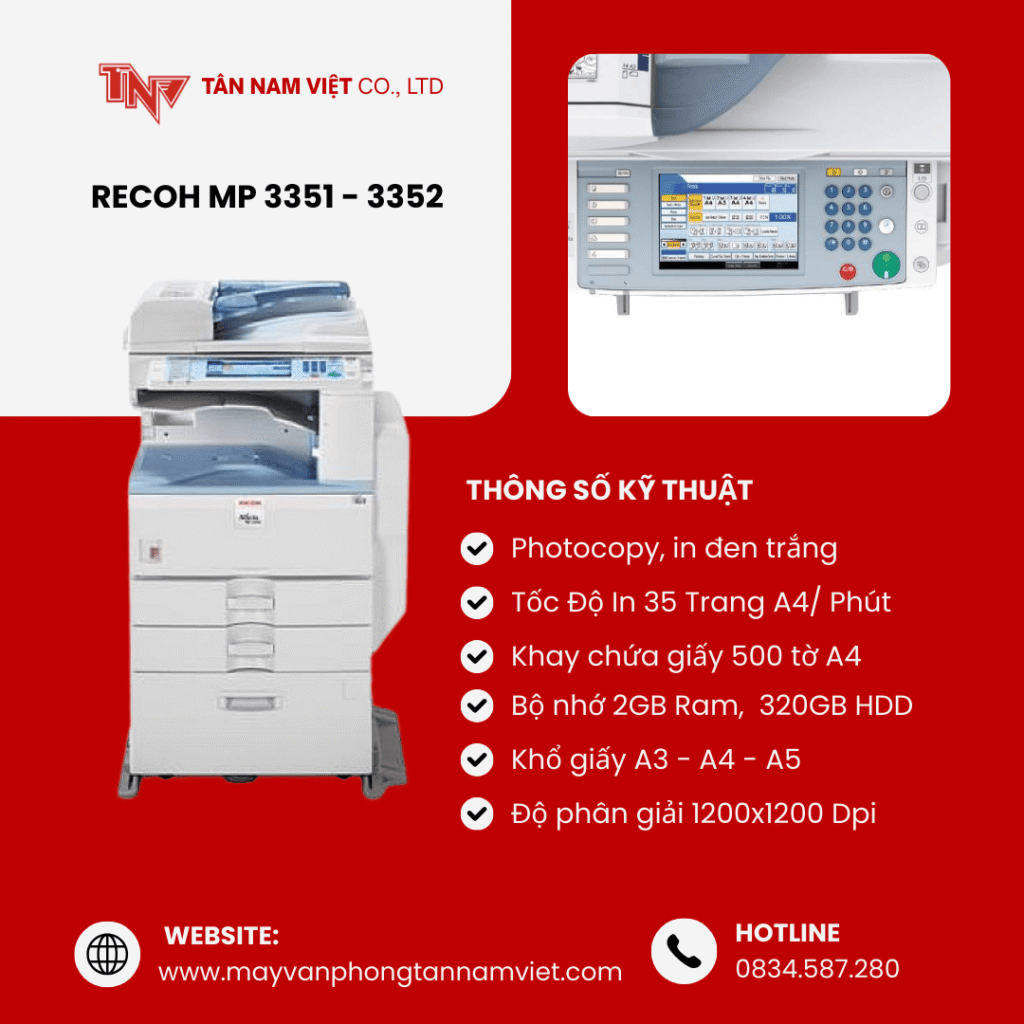 • Sao Chụp (Copy): RICOH MP Aficio 3352 cung cấp khả năng sao chụp nhanh chóng với tốc độ lên đến 33 trang/phút đối với khổ giấy A4. Độ phân giải cao (lên đến 600 x 600 dpi) đảm bảo bản sao rõ ràng và sắc nét. Máy hỗ trợ sao chụp hai mặt tự động (duplex), giúp tiết kiệm giấy và thân thiện với môi trường. Bạn cũng có thể tùy chỉnh tỷ lệ phóng to/thu nhỏ, sao chụp nhiều trang thành một, và thực hiện các chế độ sao chụp đặc biệt khác.