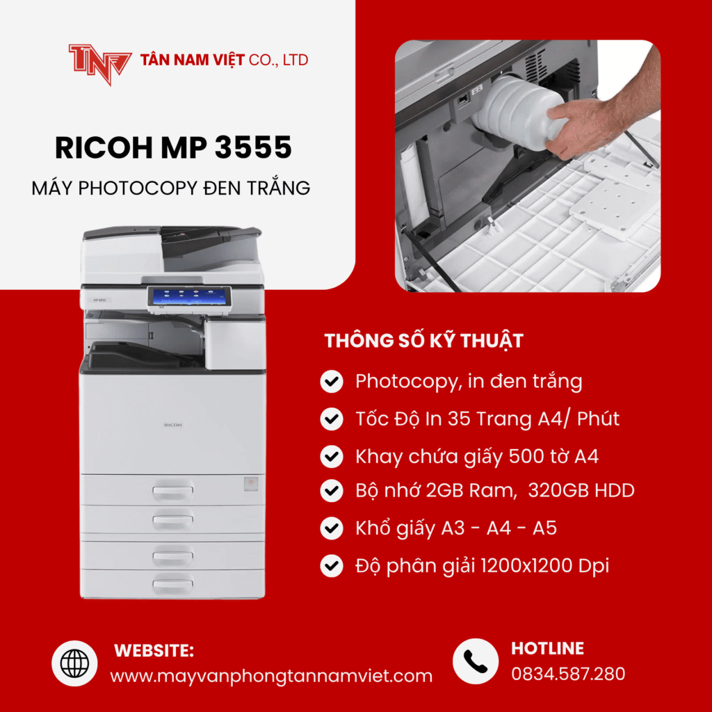 Máy photocopy Ricoh MP 3555 là dòng máy photocopy đa chức năng tiên tiến, được thiết kế để đáp ứng nhu cầu in ấn, sao chép và quét tài liệu cho các doanh nghiệp và tổ chức lớn.