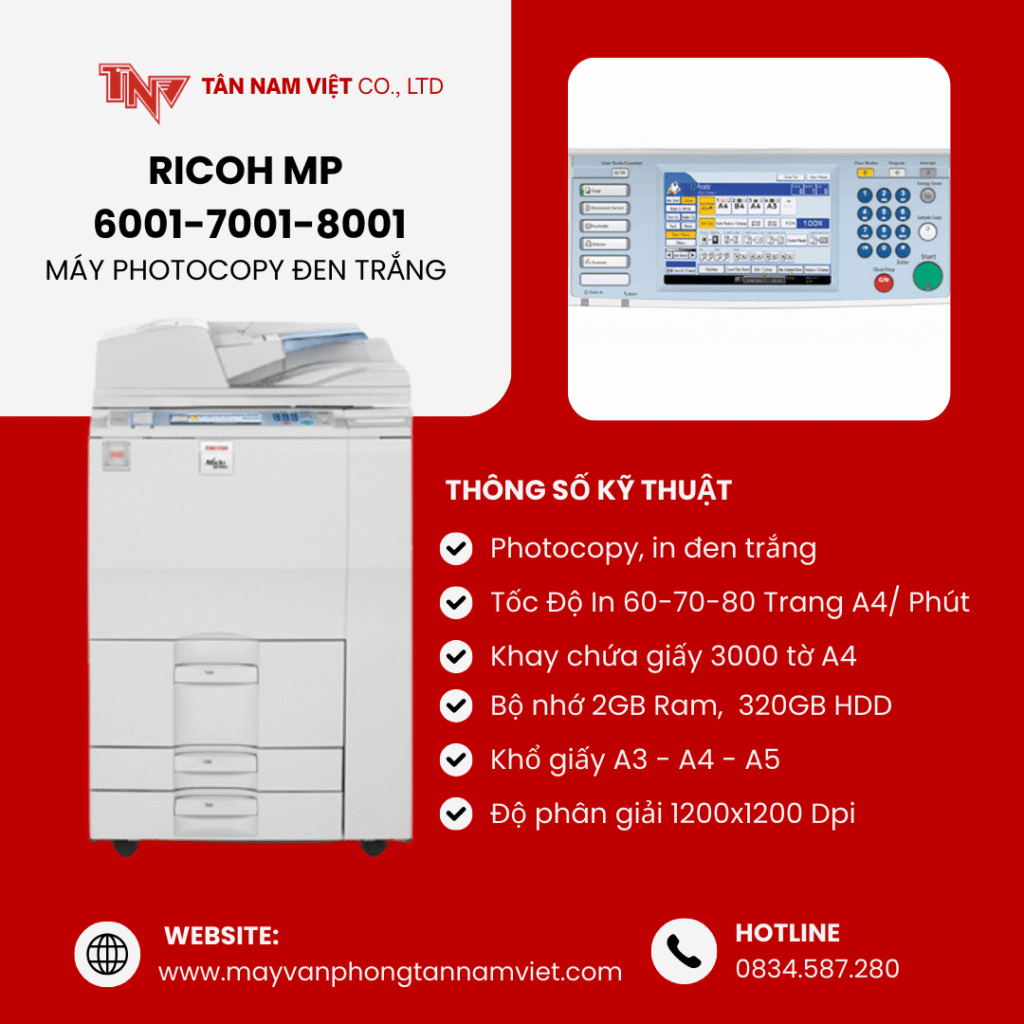 Máy photocopy MP6001 – 7001 – 8001 – 9001  đem lại kỳ vọng cao đối với cửa hàng in ấn, kinh doanh. Mua máy in Đa chức năng Laser trắng đen (MFP) Máy photocopy MP6001 – 7001 – 8001 – 9001 nhỏ gọn và giá cả phải chăng trong phân khúc máy in đơn sắc, sản phẩm phù hợp với nhiều loại công việc và in được nhiều định dạng mà không ảnh hưởng đến chất lượng.